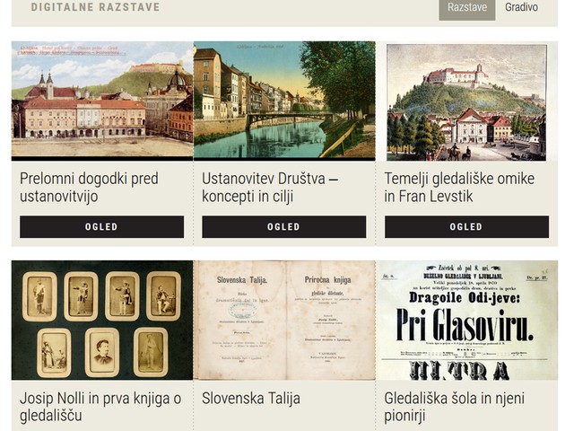SLOGI – Gledališki muzej je od leta 2012 pripravil vrsto e-razstav, ki so dostopne na portalu Sigledal. Kibernetični svet nam resda ne ponuja neposrednega stika z umetnino/eksponatom in zato z e-razstavami ne poskušamo nadomestiti »fizičnih« muzejskih razstav, lahko pa z njimi dosežemo nekaj drugega: pritegnemo obiskovalce, ki sicer ne zahajajo v muzeje in galerije; ponudimo oddaljeni pristop gibalno oviranim in krajevno oddaljenim uporabnikom; nagovorimo mlajše občinstvo; omogočamo lažji in časovno neomejen dostop raziskovalcem; izkusimo večjo svobodo pri razstavljanju (saj nam je na voljo tako rekoč neomejen razstavni prostor), kot tudi možnost poznejših dopolnitev razstave; razstavljeno gradivo samodejno postane del svetovne spletne zbirke Europeana.