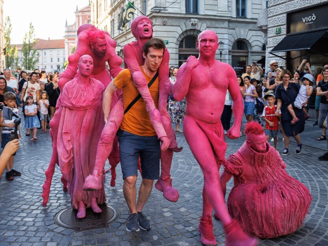 Umetniški ulični projekt, ki prepleta improvizacijo in interakcijo, ter se vedno znova spreminja glede na okolje, v katerem se nahaja, ni tipična gledališka predstava – je igra in gibanje. Migranti iz vesolja, ki so pristali na našem planetu z misijo iskanja in spoznavanja inteligentnih življenjskih oblik, provokativno razpirajo pereča vprašanja medkulturne družbe in konvencij vedenja v javnem prostoru. Da pa jih zemljani ne bi jemali preveč resno, so si nadeli zaščitno rožnato barvo. Pričakujte nepričakovan medplanetarni dialog!
