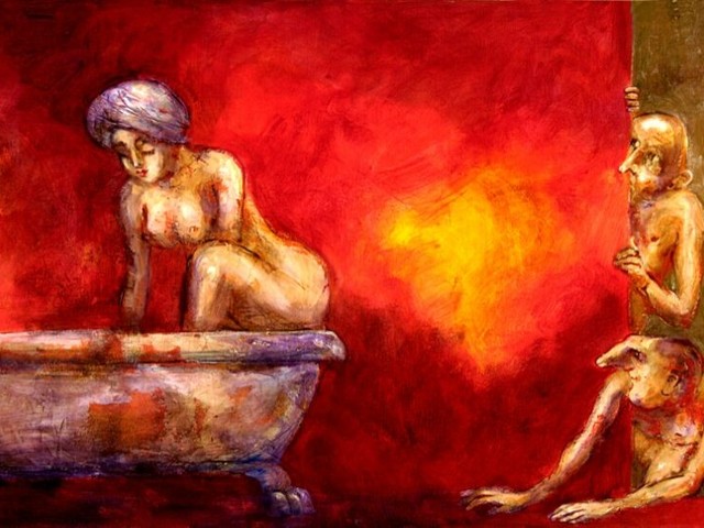 Dramski prizor je bil objavljen v zbirki slik Ejti Štih in zgodb petnajstih bolivijskih in petnajstih slovenskih piscev z naslovom Slike in zgodbe. Med njimi je tudi dramski prizor Vinka Möderndorferja Suzana in dva starca. V njem daje glas že pokojnima starcema ob opazovanju neznane ženske pri kopanju v stanovanju, kjer se je zgodil zločin zaradi ljubosumja. Zataknjena nekje med biti in ne biti zdaj obujata spomine na skupno žensko, ki je bila enemu žena in drugemu ljubica. Strasti še zmeraj niso potihnile, zamera je ostala, onadva pa sta za večno obsojena na skupno posmrtno gibanje. Grenko-sladka igra o ljubezni, življenju in smrti pa poslušalca ne postavlja le v vlogo voajerja, saj podeli glas tudi ženski.