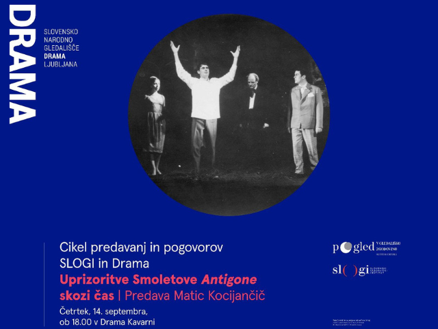 Na prvem predavanju bo Matic Kocijančič, kustos in vodja arhivske zbirke SLOGI, predstavil kritiško recepcijo uprizoritev slovite Antigone Dominika Smoleta in bogato zbirko fotografij, skic in publikacij, ki jih hranijo ikonoteka, knjižnica in arhiv SLOGI. Smoletova Antigona je bila prvič uprizorjena leta 1960 v režiji Francija Križaja (Oder 57), nato na poklicnih odrih še desetkrat. Z letošnjo uprizoritvijo v režiji Janeza Pipana se v Dramo vrača po več kot treh desetletjih.