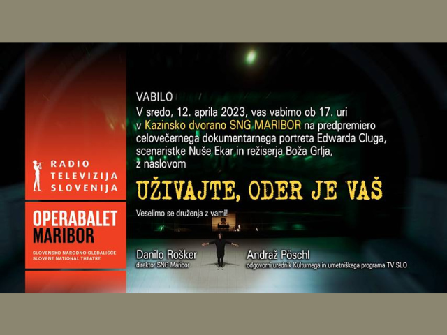 Predpremiera celovečernega dokumentarnega portreta Edwarda Cluga, scenaristke Nuše Ekar in režiserja Boža Grlja, z naslovom Uživajte, oder je vaš.