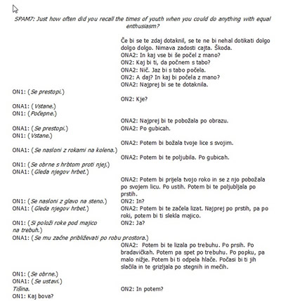 Besedilo Spamov je v originalnem jeziku (angleščini). V kolikor bi jih bilo potrebno prevesti v jezik uprizoritve, bi se mi zdelo primerno, da se predstavo opremi z originalnimi (angleškmi) podnapisi ali z adekvatno rešitvijo ohrani originalen jezik Spamov.