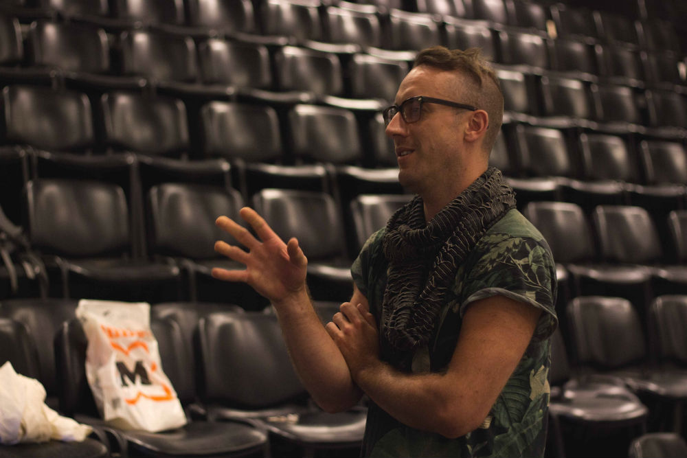 Všeč mi je, kadar povem nekaj smešnega in se ljudje smejijo z zamikom. Sedaj poznam besedilo na pamet, prvo sem improviziral in ga nato posnel na mikrofon, ga poslušal pa spet improviziral. Sedaj je besedilo dejansko zapisano, ampak prej ni bilo. Med predstavo imam v ušesu slušalko in poslušam. Iz režije mi namreč dajejo tehnična navodila, mi povejo, kdaj se bodo ugasnile luči in podobno, ker je tajming predstave zelo natančen. Vmes pa tudi poslušam posnetek svojega glasu. Tega sem se navadil z Wooster group. Na začetku poslušaš posnetek besedila, nato pa se z vajo navadiš in besedilo se samo "zliva" iz tvojih ust.