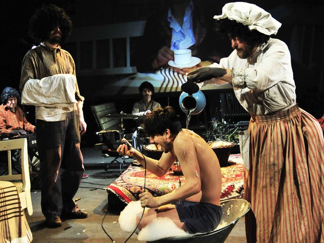 Rešitev problema? Indijanec je tisti starec, ki nosi na glavi ceneno lasuljo kostuma za noč čarovnic, na obrazu ima narisane črte, svojega psa-volka pa zamenja za alkohol, ki mu ga ponudi beli industrialec (zadnji del predvidevam – kostumi niso indikativni za socialni status likov). Kako ne uporabiti blackface, ampak ga vseeno uporabiti? Na črno pobarvaš roke, nadeneš lasulje iz iste trgovine in jih postaviš tako, da jazz trio z bobnarjem brez ritma in basistom brez posluha ustvari atmosfero časa. (Drobni opombi: glasbeni spodrsljaj je bil enkraten dogodek, kar se seveda zgodi, vseeno pa ima jazz korenine v New Orleansu v dvajsetih letih, t.j. trideset let kasneje. Gre za nekakšno korelacijo med glasbo temnopoltih in tuljenjem volkov, ki se je zavedajo ustvarjalci.) Se pa pojavi tudi barvna televizija – očitno je čas dogajanja pač tisti, ki ga v predstava v trenutku potrebuje. Ergo, če že nismo kritični glede časa (opozorjen sem bil, da anahronizmi niso tako hud zločin, kot se trenutno zdijo meni), bodimo kritični vsaj glede nezaščitene vsebine: argument, da se je to dogajalo takrat, in ne danes, ni utemeljen, če ne moremo določiti časa.