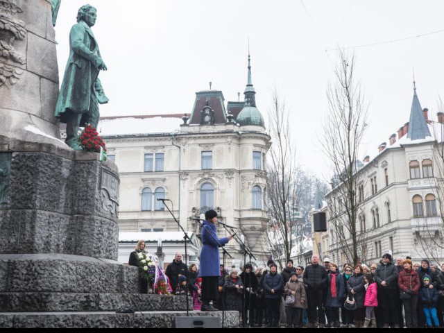 Tradicionalni recital na Prešernovem trgu, ki je potekal pod naslovom Lepa beseda lepo mesto najde, se je pred pesnikovim kipom kot vsako leto začel z Zdravljico v interpretaciji Aleša Valiča, nato pa je spregovorila predsednica združenja Saša Pavček.