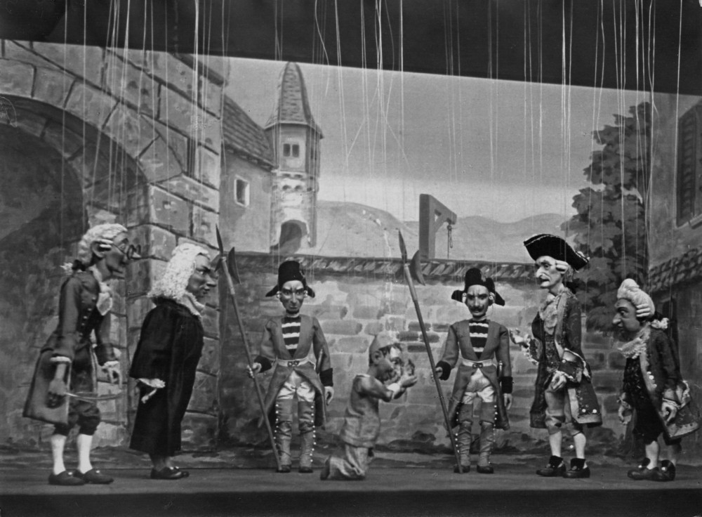 Franz Pocci, Čarobne gosli. Režija: Jože Pengov, izdelava lutk: Ajša Pengov, scenograf: Milan Klemenčič. Arhiv Lutkovnega gledališča Ljubljana. — Prva predstava, v kateri je Peter Dougan animiral lutke.