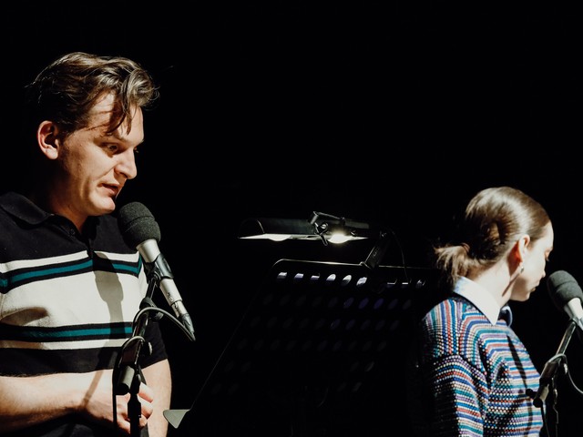 Saška Rakef: Celoten proces je potekal zelo spontano. Radijska igra v živo ni klasična uprizoritev, ni le bralna uprizoritev z mikrofoni, temveč je treba razmišljati o tem, kako prinesti radijsko igro v prostor. Radijska igra ponuja več različnih načinov za poigravanje s tem, kot je že omenil Matevž: vse se preseli v glas, v ten glasu, ritem, drobne detajle, ki jih mogoče odrska uprizoritev zaradi distance odra do občinstva fizično niti ne more prenesti, mikrofon pa lahko približa vsak vdih in izdih – in to je velika prednost. Druga stvar je to, kar sem že v uvodu omenila, da je zame to izjemno muzikalno besedilo. Dejansko sem zaslišala, kot da je glasba tretji igralec na odru in da morajo z igralcema postati ena organska celota. Potem je pa še dejstvo, da je pri delu v studiu postprodukcija izjemno dolga: govorimo tudi o dvajsetih terminih ali več oziroma o več kot osemdesetih urah, kjer se lahko res poigravamo na sekundo natančno, saj je od tega odvisno, kako se delajo evolucija zvoka, njegova dinamika in jakost. Izvedba radijske igre v živo tako zelo natančnega doziranja in strukturiranja ne omogoča; na drugi strani pa omogoča živ trenutek, ki je sam po sebi izjemno zanimiv, saj je skoraj tako, kot da bi orkester igral skupaj oziroma en majhen bend. Vidik radijske igre je še ta, da jo pogojuje odnos do mikrofona, s katerim lahko delamo oddaljevanje, približevanje in s tem ustvarjamo zvočne stožce, s katerimi slikamo prostore. Tudi iz tega smo izhajali pri izvedbi v živo.