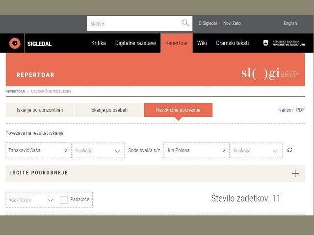 Prav posebne možnosti ponuja iskanje s pomočjo navzkrižnih poizvedb. Izvemo lahko, kolikokrat in v katerih produkcijah so sodelovali posamezni ustvarjalci – igralci, režiserji, dramaturgi, lektorji, koreografi, scenografi … Tako lahko na primer ugotovimo, kolikokrat je določen režiser režiral besedila enega in istega avtorja, ali je posamezno besedilo morda režiral večkrat, v koliko produkcijah so sodelovali posamezni igralci, kolikokrat sta sodelovala določen režiser in dramaturg … Dela Williama Shakespeara je na slovenske gledališke odre največkrat postavil Osip Šest, in sicer 20-krat – prvič leta 1920 (Sen kresne noči), zadnjič pa leta 1940 (Hamlet), obakrat v SNG Drama Ljubljana. Zakonca Polona Juh in Saša Tabaković sta na odrskih deskah skupaj stala v enajstih gledaliških predstavah.