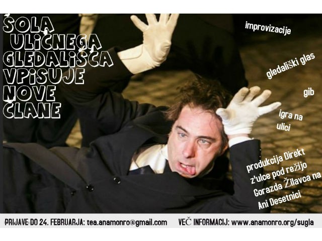 Vabljeni vsi, ki bi si radi nabrali izkušenj in znanja za nastopanje in ustvarjanje gledališča na ulici. Avdicija za vpis v program ŠUGLE bo potekala konec februarja, v obliki pogovora ali kratke predstavitve. Predhodne izkušnje niso potrebne. Prijave v Gledališča Ane Monro zbiramo do 24. februarja.