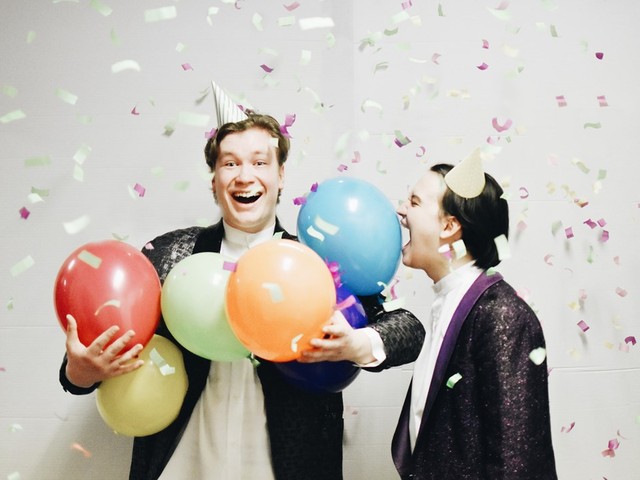 Scenografija je minimalistična, sestavljena iz štirih sten, kjer je navzven vse črno in turobno, skozi okna v stenah pa opazujemo belo notranjost, kjer se odvija zabava. Ta je vedno bolj bučna in glasna, gledalec pa, ko se stene počasi odpirajo, spoznava družbo v prostoru in postaja del nje.