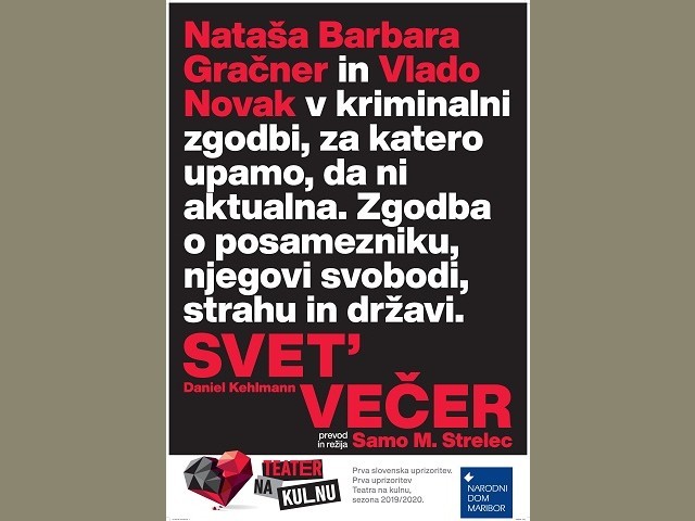 Uprizoritev Svet' večer začenja nov programski sklop Narodnega doma Maribor, ki so ga poimenovali Teater na kulnu. Ta bo ponujal dramske uprizoritve in druge gledališke dogodke manjšega formata na odru v kleti Narodnega doma.
