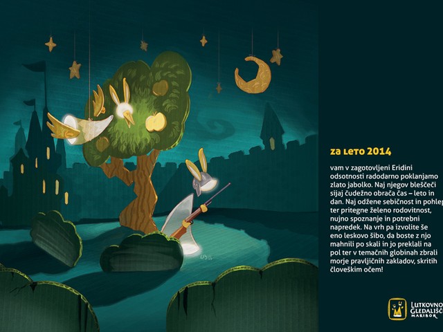 Za leto 2014 vam v zagotovljeni Eridini odsotnosti radodarno poklanjamo zlato jabolko. Naj njegov bleščeči sijaj čudežno obrača čas - leto in dan. Naj odžene sebičnost in pohlep ter pritegne želeno rodovitnost, nujno spoznanje in potrebni napredek. Na vrh pa izvolite še eno leskovo šibo, da boste z njo mahnili po skali in jo preklali na pol ter v temačnih globinah zbrali morje pravljičnih zakladov, skritih človeškim očem!
