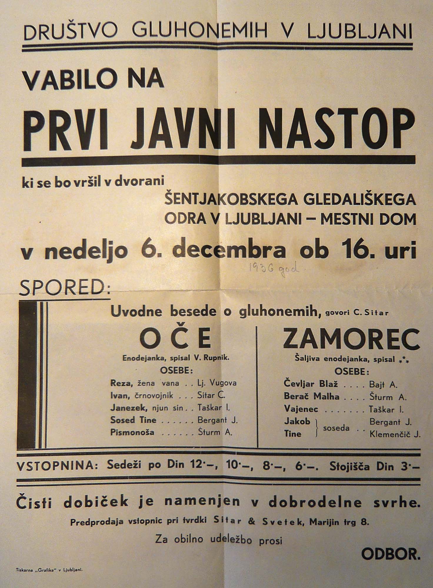 Za uvod v proslavo 40-letnice obstoja ljubljanskega Zavoda za gluhoneme so gluhi igralci 7. septembra 1940 v Zagrebu pod pokroviteljstvom zagrebškega župana M. Starševića pripravili svoj 25. nastop. O tej svojevrstni in zanimivi prireditvi so obširno pisali zagrebški dnevniki. Načrtovan je bil tudi nastop v Beogradu, ampak druga svetovna vojna je onemogočila nadaljnje nastope. Vir: Arhiv RS (AS 2052 t.e. 2)