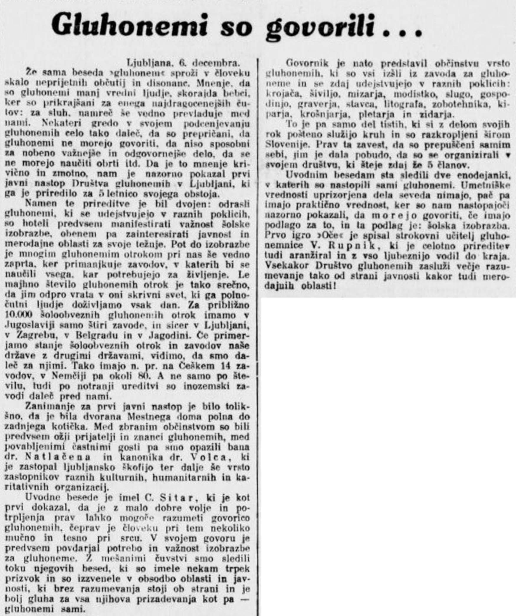 »Gluhonemi so govorili«, gledališka kritika V slovenskem časopisu Slovenec so po prvem javnem nastopu napisali novico, da so gluhonemi igrali. Piše, da je javnost mislila, da gluhi niso bili sposobni govoriti z živo govorico, a so se zmotili. Gluhonemi so govorili. Želeli so pokazati javnost, da si zaslužijo možnost do izobrazbe in zaposlovanja. Bili so uspešni. Vir: Slovenec, 7. december 1936, str. 3