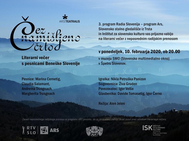 Literarni večer Čez namišljeno črto je drugi te sezone v ciklu Ars teatralis, katerega glavni namen je z umetniško besedo povezati matico z zamejstvom. Idejni vodja tega gledališko-radijskega cikla je režiser Alen Jelen. Tokrat se je želel pokloniti literarni besedi v narečju, ki ga govorijo v Beneški Sloveniji. Na dogodku, ki bo potekal v ponedeljek, 10. februarja ob 20.00 v muzeju SMO (Slovensko multimedialno okno) v Špetru Slovenov, bomo lahko slišali poezijo pesnic Marine Cernetig, Claudie Salamant, Andreine Trusgnach in Margherite Trusgnach. Vse štiri pišejo v narečju, v znamenju narečja in izročila Benečije pa bo tudi glasba, ki jo bosta izvajala Davide Tomasetig in Igor Černo. Književno ustvarjanje v narečju pa bo med drugim na dogodku predstavila ena od ustanoviteljic Dvojezičnega šolskega središča v Špetru Slovenov in dolgoletna ravnateljica te šole Živa Gruden.