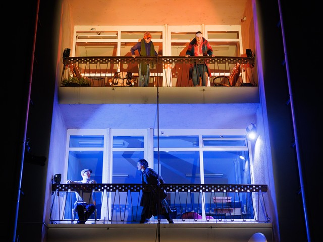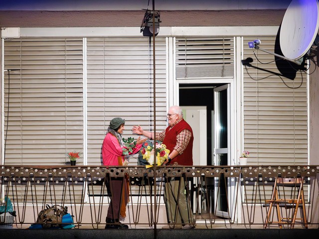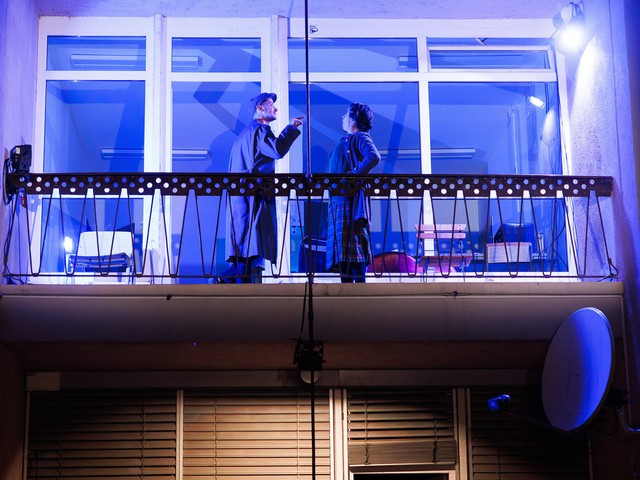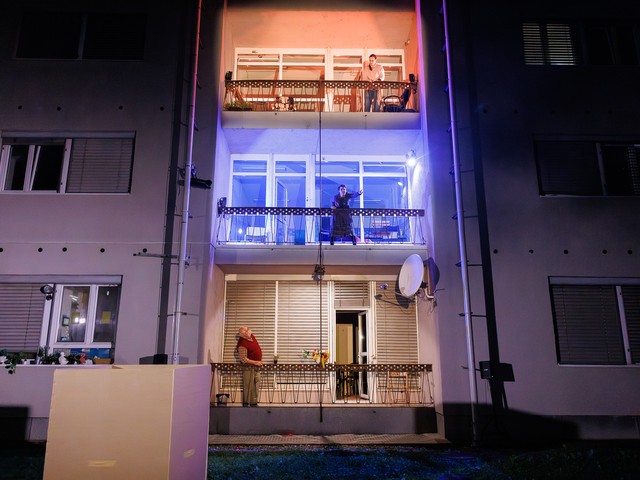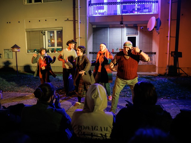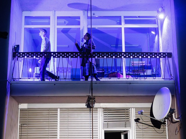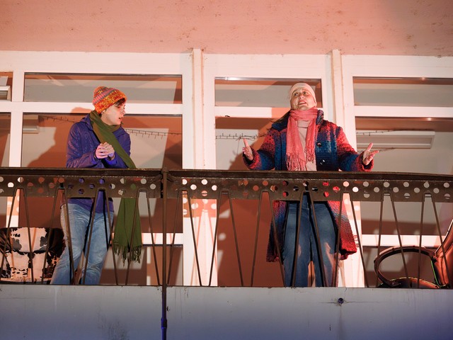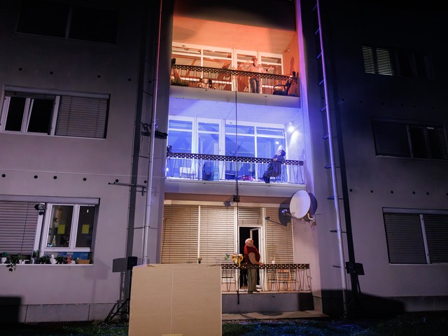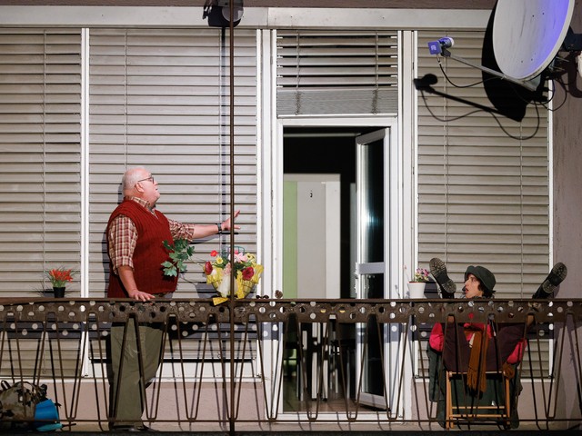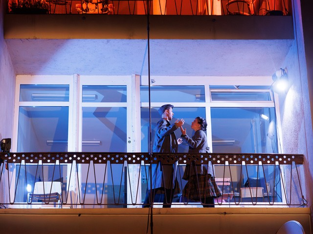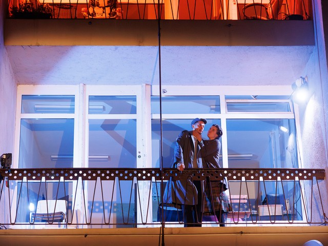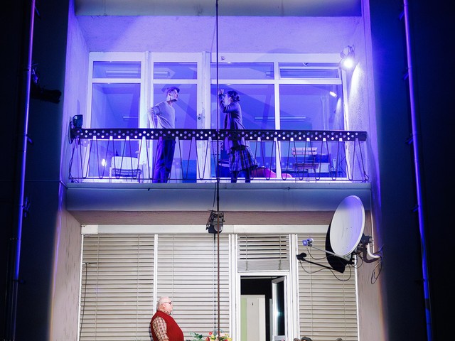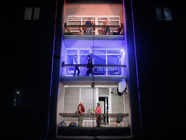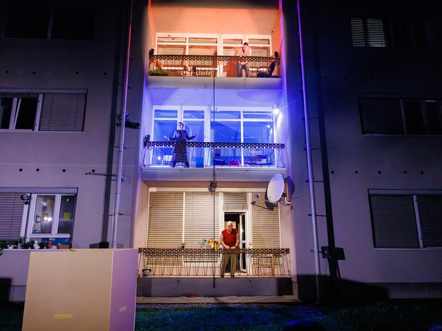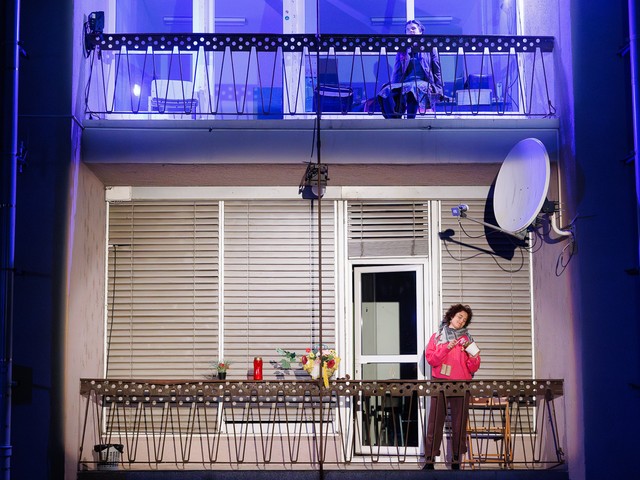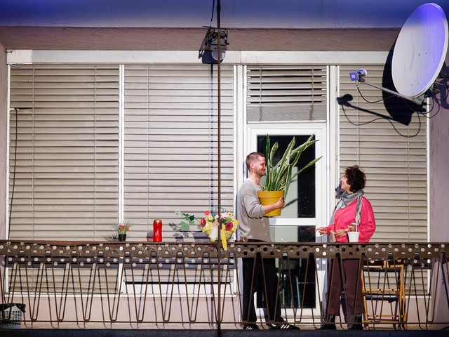 Med stanovalci se tekom predstave razvijajo odnosi – tako med skupaj živečimi pari, kot tudi med sosedi, pri čemer njihova komunikacija poteka na nekoliko »retro« način: osebno, z balkona na balkon. Del dogajanja se odvija tudi na dvorišču, pred vhodom v blok.