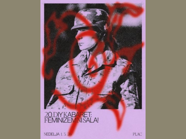 DIY kabaret: Feminizem ni šala! je cikel kabaretov, ki razpira prostor, kjer nastopajoče_i ustvarjajo brez cenzure in omejitev klasičnih odrov – kjer je »grdo« lepo, nenormativno zaželeno, »neprivlačno« privlačno. V ospredju so vsebina, želje in užitek, napake pa niso le dovoljene, ampak celo zaželjene. Znotraj serije kabaretov preizprašujemo teme, povezane s spolom in spolno usmerjenostjo, ki so v družbi pogosto prezrte ali potlačene. Hkrati stremimo k ustvarjanju varnega prostora za vse prisotne. 20. jubiljena edicija bo prav posebna. Pričakujete lahko velik nabor skupinskih točk, živo glasbo, artistke_e v zraku in na tleh, rdeča nit kabareta pa bo antimilitarizem.
