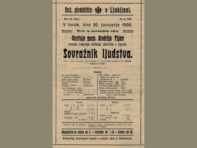 Februarja na oder SNG Drama Ljubljana prihaja Sovražnik ljudstva. Ta drama Henrika Ibsena tematizira boj idealističnega posameznika, ki iskreno zasleduje resnico in pravico, s kolesjem togega družbenega sistema, ki se silovito upira kakršnikoli spremembi in prepoznanju lastnih napak. Gre za eno najbolj cenjenih Ibsenovih dram z izjemno razgibano zgodovino interpretacij in uprizoritev. Pred premiero lepo vabljeni na zgodovinski prelet gledaliških srečanj z Ibsenovimi dramami na slovenskih odrih skozi fotografsko in kritiško gradivo, ki ga bo predstavil dr. Matic Kocijančič, kustos in vodja arhivske zbirke Slovenskega gledališkega inštituta.