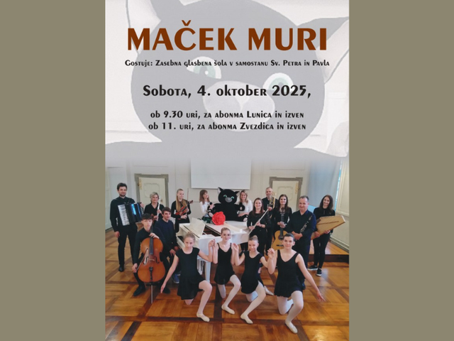Ob 50- letnici izida knjige Maček Muri, se bo v Mestnem gledališču Ptuj, predstavila glasbena šola v samostanu sv. Petra in Pavla, z glasbeno izvedbo pravljice o črnem mačku iz Mačjega mesta, o njegovi prijateljici Muci Maci, o mačjem razbojniku Čombeju in drugih mačkah iz mačjega mesta.