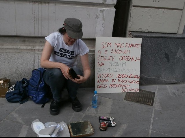 Miša Gams je mag. antropologije vsakdanjega življenja, intelektualna prostitutka in performerka, ki želi aktivirati ljudi na ulici, v njih vzdramiti silovita čustva in jih vzpodbuditi k razmišljanju o določeni temi. V petek, 30. 5. bo izvedla protestni performans čiščenja čevljev na naslednjih lokacijah (tokrat bo poudarek na osveščanju študentov o tem kaj jih čaka po zaključku študija):