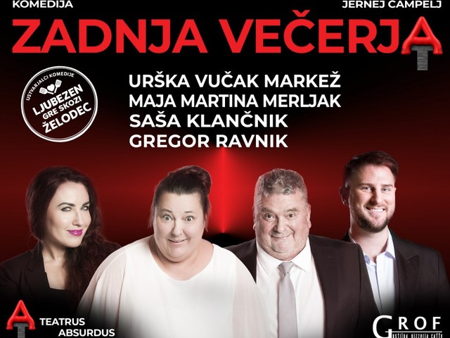 Zadnja večerja je predstava o dveh čisto običajnih ljudeh, ki se v enem samem popoldnevu znajdeta ujeta v vrtincu nesporazumov, naključij in “dobronamernih” ljudi okoli sebe. Tako, da se človek resnično vpraša: Kdo sploh vodi moje življenje – jaz ali vsi drugi? Gre za toplo, igrivo in povsem odbito komedijo, kjer se v tempu svetlobne hitrosti menjujejo liki, maske in energije — in občinstvo drži v smehu od prve do zadnje replike. Nova uspešnica, nova pojedina za dušo. Zadnja večerja.