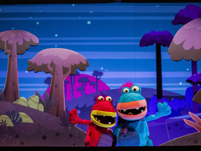 Režiser Jaka Ivanc in avtor likovne podobe Natan Esku sta v Lutkovnem gledališču Ljubljana ustvarila že predstave Zverjasec, Zverjašček, Bi se gnetli na tej metli in Najprisrčnejši velikan, prve tri zagotovo kakovostne uspešnice, ki so še danes na sporedu gledališča, čeprav je od premiere prve minilo že več kot desetletje. Te reference ustvarjalnega sodelovanja pri novi lutkovni predstavi o dveh prijateljih dinozavrih, prav tako za najmlajše gledalce (3+), ne moremo spregledati, saj predstava v marsičem uporabi podobne elemente ter vzpostavlja enak uprizoritveni model. Dogajanje umesti v privzdignjen, horizontalni okvir, ki določa in zamejuje uprizoritveno sliko, znotraj katere premični scenski elementi oblikujejo različna okolja, v katerih se znajdeta naslovna lika. Plišasta junaka z izpostavljenimi stiliziranimi okroglimi očmi ter v barvnem kontrastu s poudarjenimi velikimi usti, ki se na široko odpirajo v razigrani in vedri komunikativni ekspresiji, spominjata na živalske like iz prej omenjenih predstav. Nasploh te pravljične živalske like zaznamujeta vizualna privlačnost in značajska simpatičnost, ki prispevata k temu, da jih gledalci vzamejo za svoje in se z njimi zlahka povežejo. S slogovnega vidika tudi novo, za predstavo nastalo besedilo Jureta Karasa, prav tako avtorja songov in glasbe, ostaja v podobnih tirnicah – v spletu besed, rim in songov, čeprav se z naslonitvijo na vprašanja in s številčnostjo songov pripovedna logika zgodbe prši v posameznih sekvencah ter se v celokupnem odtisu umika šarmu neposrednosti uprizoritvene komunikacije.