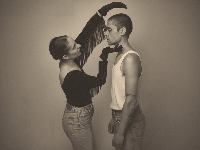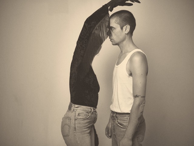 Ko pridemo v dvorano, performerja že sedita na odru, mirujoča in zreča si v obraz, medtem ko v ozadju tiho igra ambientalna glasba, ki poglablja intimo, ustvarjeno med njima. Trenutke zatem, ko navzkriž skleneta roke in s skupnim nadzorom teže polagoma vstaneta, vstopimo v drugačno časovnost: ambientalno zamaknjenost, ki je sporočala intimo in zasebnost, nadomesti gibalno-zvočni razvoj situacije, ki naznanja določen konflikt, a hkrati tudi njegovo spekulativno razrešitev – poglobitev.