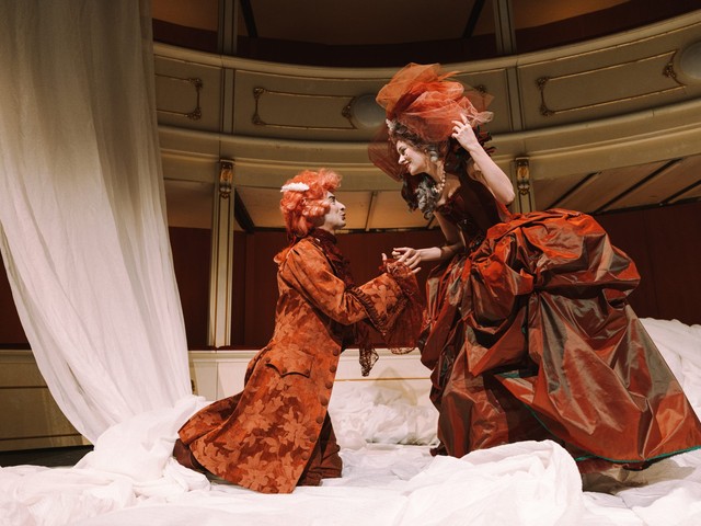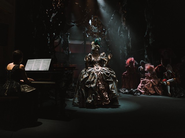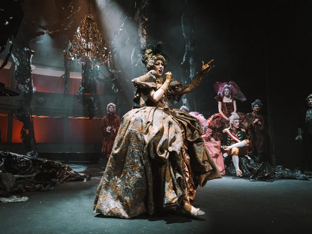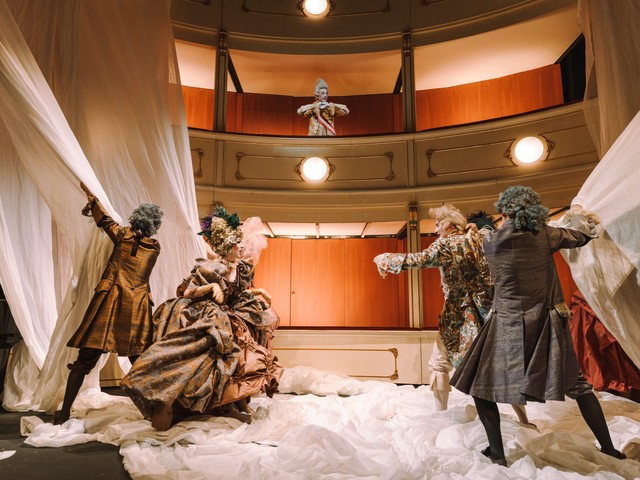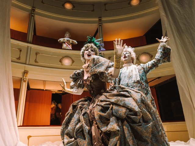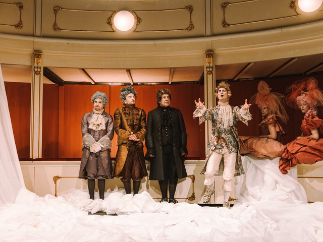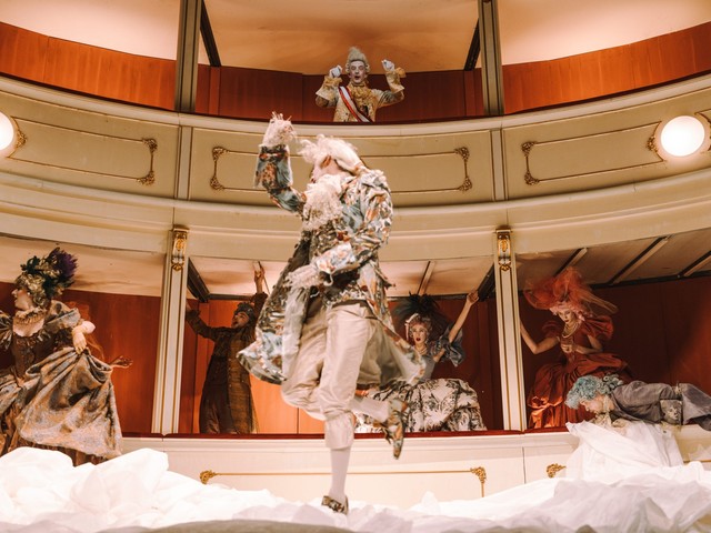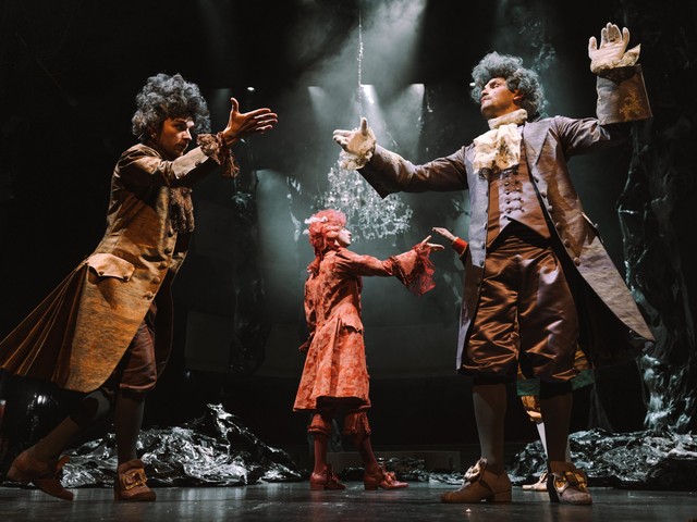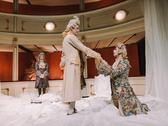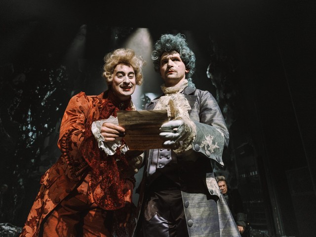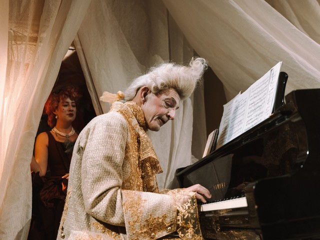 Mozart in Salieri sta drug z drugim soočena v okoliščinah cesarskega dvora, kar izvrstno podpre scenografija prvega dela. Cesar Jožef II. (Davor Herga), umeščen v prvo nadstropje lož, že s samo pozicijo nastopa kot véliki lutkar, ki vleče vrvice svojih vdanih podanikov, Grofa von Stracka (Matija Stipanič), Barona von Swietna (Matevž Biber) ter dvorjank (Tina Rojko, Eva Mlakar Poštrak). Kljub svoji poziciji moči je Hergov Cesar simpatično nepopoln (sploh, ko skuša na klavir odigrati Salierijevo koračnico dobrodošlosti), Stipaničev von Strack in von Swieten Bibra pa nastopata v maniri lutk, z izumetničenim govorom in polna pretiranih in/ali krčevitih gest. Celotna slika cesarskega dvora deluje malone groteskno – tudi po zaslugi kostumografije (kostumografija Marita Ćopo, asistentka Mia Popovska), ki je odlično izvedena, do skrajnosti prignana dvorna noša 18. stoletja – z lasuljami in belim pudrom vred. Tega ne manjka niti Stanči punči kunči (prevod drame, polne besedne igrivosti, je delo Branka Gradišnika), Konstanci Julije Klavžar, ki uspešno parira svojemu mucku bucku Mozartu. Z njim se predaja živahnim igrivostim in ob njem se v njej prebudi užaljena jedkost – pa se samosvoje drzno zoperstavi frustriranemu Salieriju.