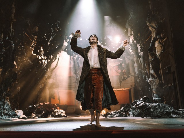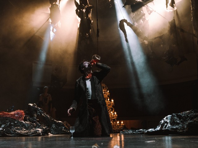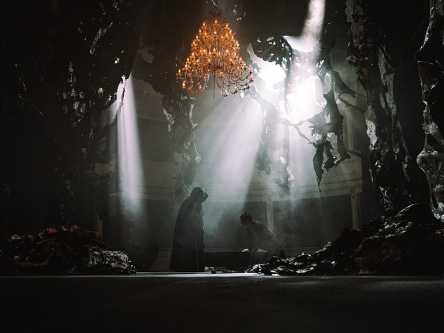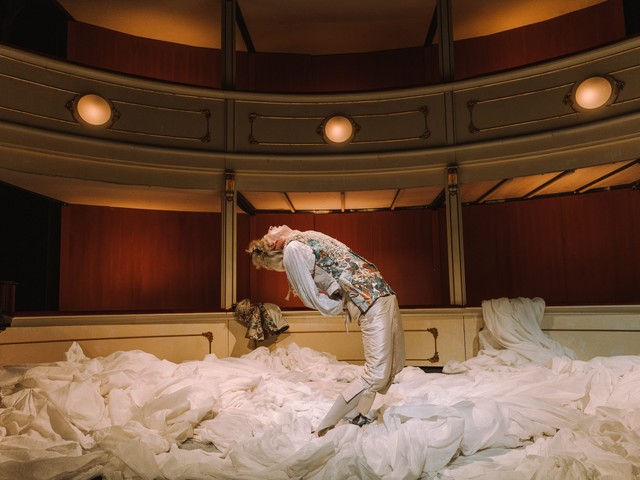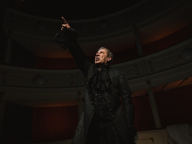Razpadanje ljubezenske zveze med Mozartom in Konstanco, njegova denarna stiska, mešani odzivi na njegova glasbena dela, očetova smrt – vse to Amadeusa žene proti koncu. V drugem delu iz scene v sceno stopa globlje v propad, ob tem pa ustvarja vse izvirnejše umetnine. Ta del scenografsko zaznamujejo razcefrane črno-sive tkanine (?), ki spominjajo na cape in pajčevine ter napovedujejo razpadanje persone genialnega skladatelja. Lože so potisnjene v globino, kar igralno površino znatno poveča, a to k uprizoritvi bistveno ne prispeva – prej ji odvzame. Manj čvrsta dramaturgija dogajanja, epizodna razdrobljenost in scenografska pokrajina usihanja, ki je zastavljena preveč na veliko, v drugem delu manjšajo naboj igre. Tudi Koprivnikovi kreaciji usiha moč, v iskanju trpečih tonov obupa ne prepriča tako, kot je poprej s polnokrvnostjo entuziasta. Posebej škoda je, da je prizor pisanja Rekviema potisnjen v globino odra, kjer Mozart zamaskiranemu Salieriju narekuje svojo poslednjo mojstrovino. Režija distanco izkoristi za zvočno efektiranje odmevanja, ki nam misli napeljuje na tunel prehoda v smrt, kamor nepovratno stopa Amadeus, a v parterju z njegovim poslavljanjem izgubimo stik – ravno, ko bi si intimnosti bližine najbolj želeli.