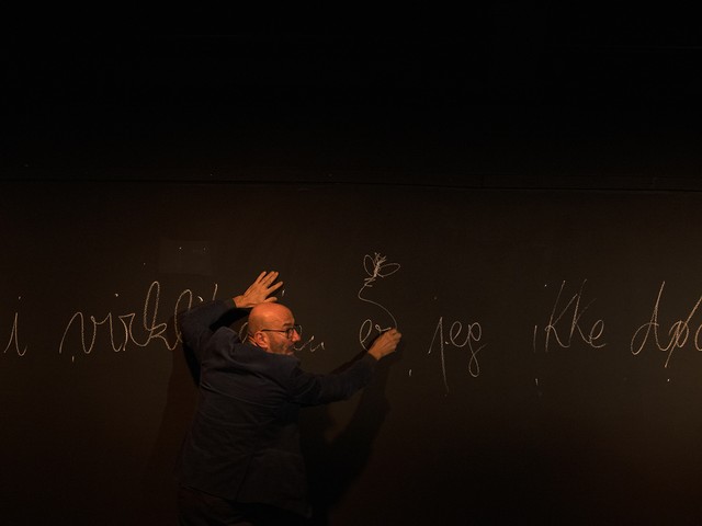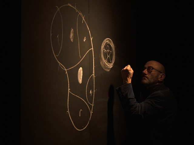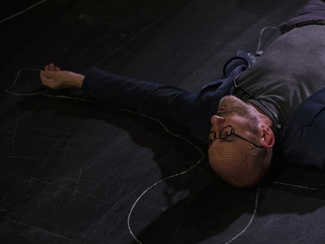 Intenziteto omenjene vsebine omogoči naravnanost besedila na tesen igralčev dialog z občinstvom. Igralec Boris Ostan ga ustrezno umesti v intimno vzdušje studia MGL, ki v krožno zasedanje sprejme le nekaj več kot dvajset gledalcev. Med njimi se nenehno giblje, jih obhaja, nagovarja, išče očesni stik in ustvarja nekakšno krožno dinamiko vsega obsegajočega, tke vezi med vidnim in nevidnim. Sprva črne stene, ki spominjajo na praznino, maternico ali vesolje, se z Ostanovimi potezami s kredo spreminjajo v »učilnico življenja«, v površine za porajanje podob, ki ravno v svoji preprostosti gradijo na simbolični večpomenskosti in v sebi nosijo potencial nenehnega čudenja. Sicer izpraznjen prostor omogoča osredotočenost na narativno vsebino predstave in pušča veliko prostora za režijo notranjih svetov gledalca, ki ga Ostan tudi z neposrednim povabilom k temu, da si predstavlja svojo lastno smrt, spodbuja k internalizaciji uprizoritvene vsebine. Tako se verbalna in vizualna reprezentacija podob življenja ne le ves čas spajata z intimnim doživljanjem gledalca, temveč hkrati tudi pričata o nezmožnosti tega, da bi vso kompleksnost življenja zajeli v kakršni koli upodobitvi: v tem leži opozorilo na pustost eksistence, ki se izogiba sestopa v globino, opozorilo na past bivanja, ki obstaja le na površini, kakor na površini sten obstajajo podobe mnogoterih življenjskih oblik, ki jih Ostan sprva počasno in sistematično, nato pa vse bolj zagnano s kredo nanaša na tla in stene studia. V takšni vizuri se tudi začetno izhodišče vstopa v predstavo, ki na tla zariše mesto zločina, prelevi v »kraj, kjer človeka ni«, s tem pa naznani vprašanje o tem, ali mogoče ne gre za smrt, temveč za odsotnost človeka sredi lastnega življenja. Strah pred sestopom v globino predstavi na tla zarisan kit, ki človeško truplo uokviri v notranjost svojega želodca. Kit postane osrednji povezujoči simbol sicer fragmentiranega besedila, njegov trebuh pa dovolj velika, mehka in oblazinjena maternica za odraslega, v katerem, plavajoč v prebavnih sokovih, ostaja v zavetju poznanega. Vsepovsod okoli pa (morda nikoli izkušen) ocean.